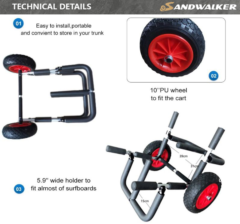 The Double Paddle Board Cart is specifically designed to provide safe and convenient transportation for two boards, ensuring ease and comfort throughout your journey. Crafted with exceptional quality, the cart features a high-quality aluminum construction that combines durability with a lightweight design, enabling it to effortlessly bear significant weight.