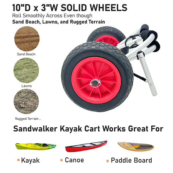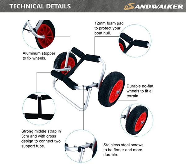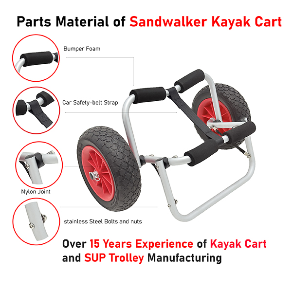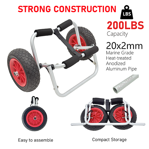 The Kayak Trolly Cart boasts a heavy-duty anodized aluminum frame, which not only guarantees its sturdiness but also provides excellent resistance to corrosion.