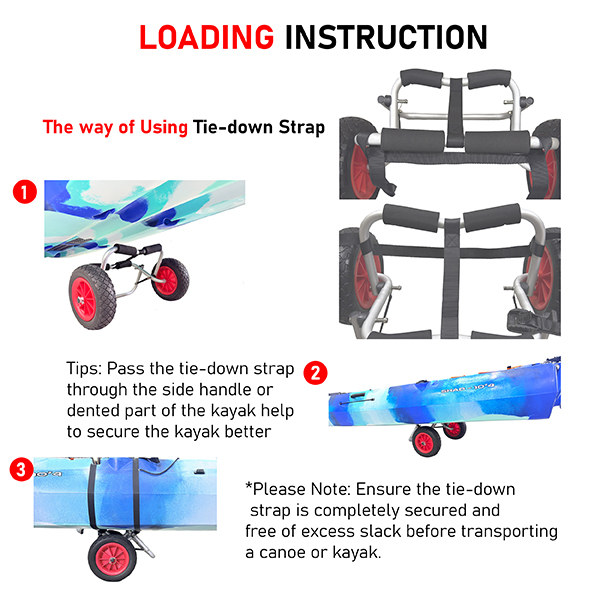 To further secure your kayak or canoe during transportation, the trolley cart includes two 1-inch by 12-foot long tie-down straps.